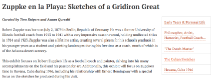 The challenges I encountered were easily overcome. The greatest challenge I faced was in making something that the general public would find enjoyable and nice to look at. I wanted to make sure my digital rendition did justice to Robert Zuppke’s accomplishments and compelled people to keep reading through each section. Finding that balance between readability and form was difficult, but I succeeded by simply taking a step back and asking myself, “would I even read this to the end myself?” By the time I finished my project, my answer was a resounding yes and I was very proud of the work I produced.